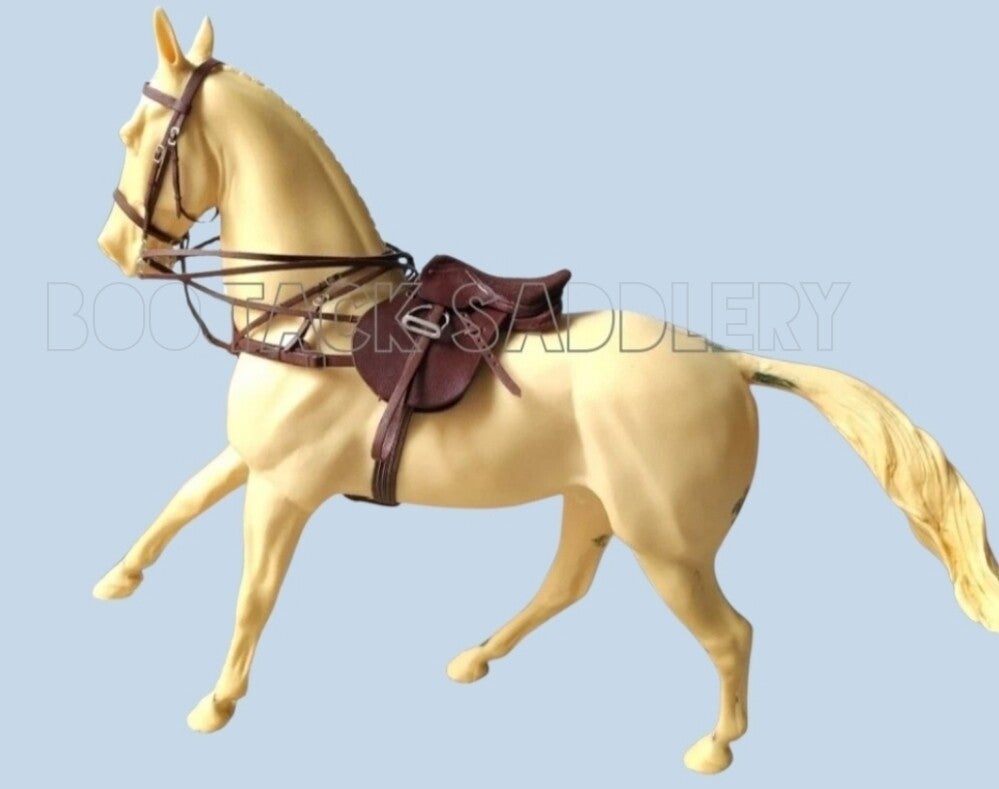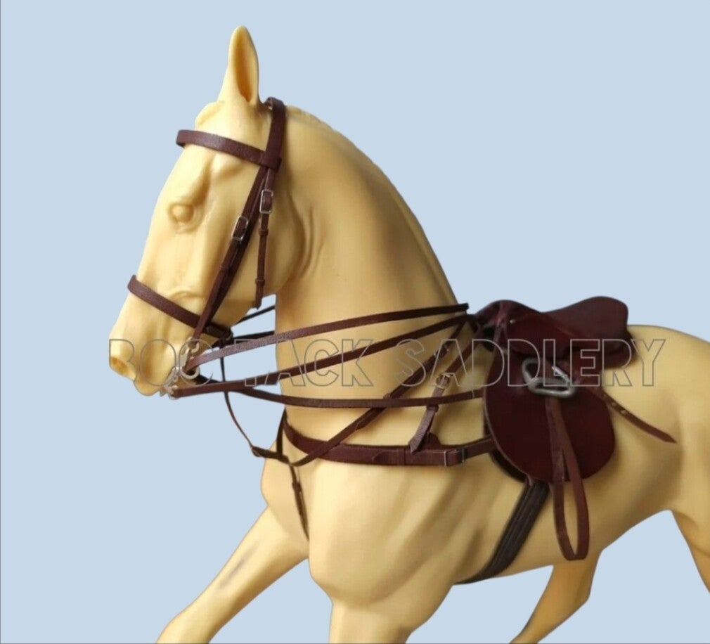 Leather polo set complete with: pelham bridle with draw reins, standing martingale, breastplate and polo saddle with suede seat.