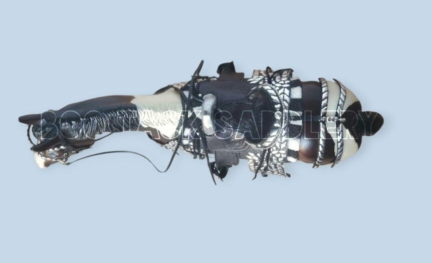 Full Western Parade set adorned with tooled patterns, silver metal work and "gems". All fully adjustable with working buckle and tongue fastenings.
