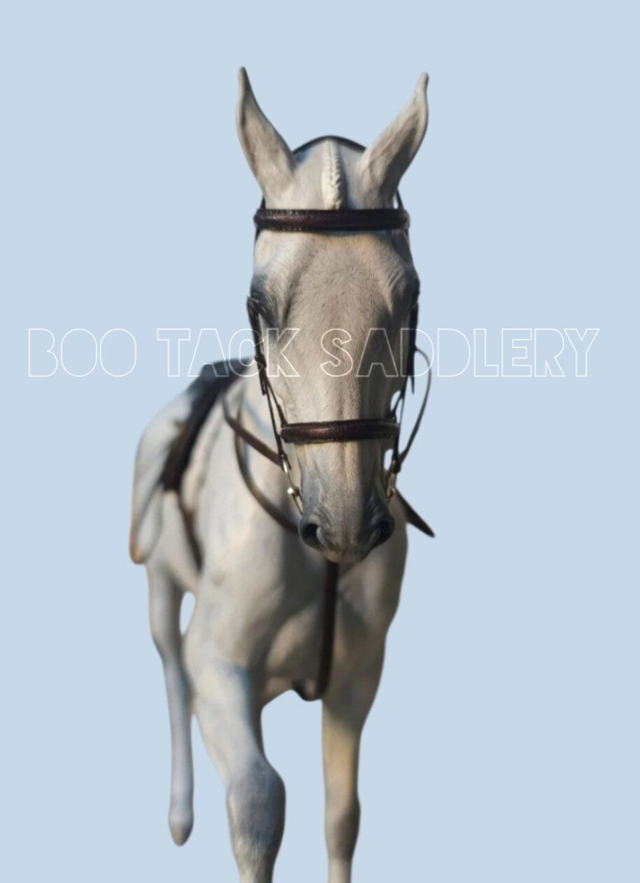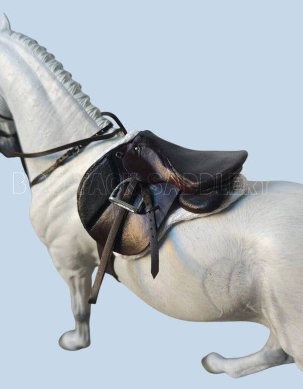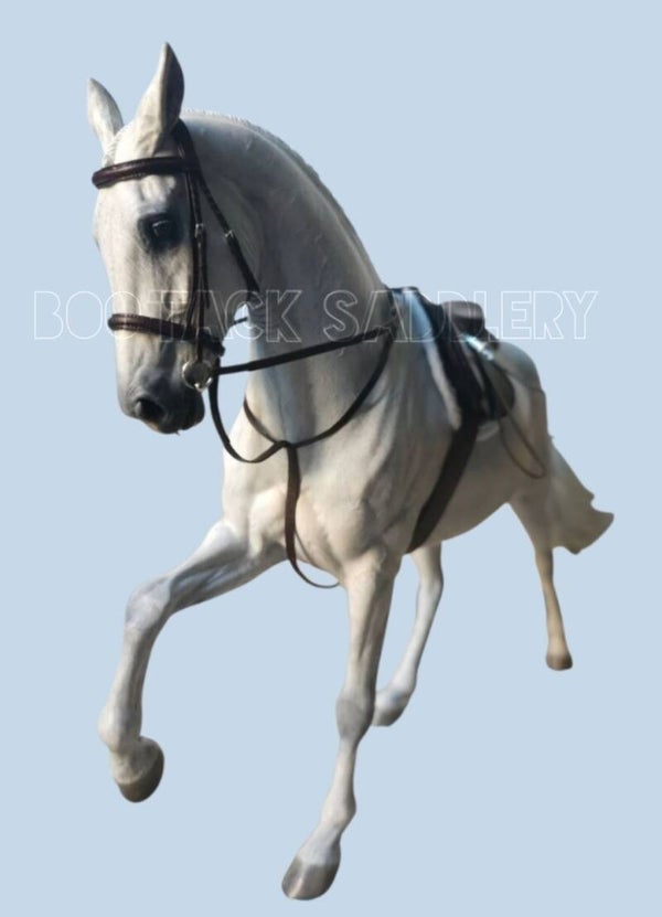 Full Equitation set includes: snaffle cavesson bridle, standing martingale, hunt seat saddle, leather girth and white saddle shaped pad.