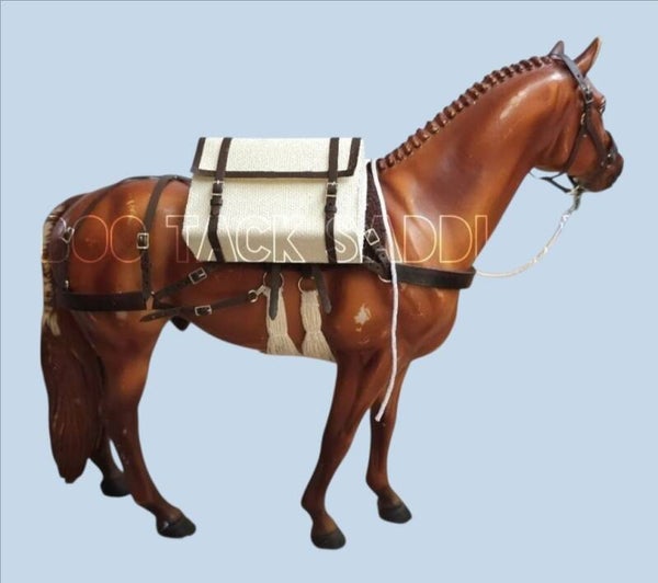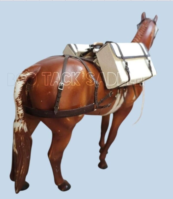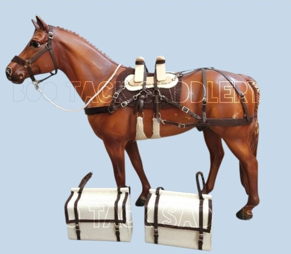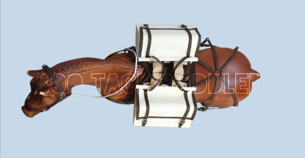 Sawbuck saddle pack set includes: halter with rope, sawbuck saddle and straps, double cinch, fleece saddle pad and 2 useable canvas bags.